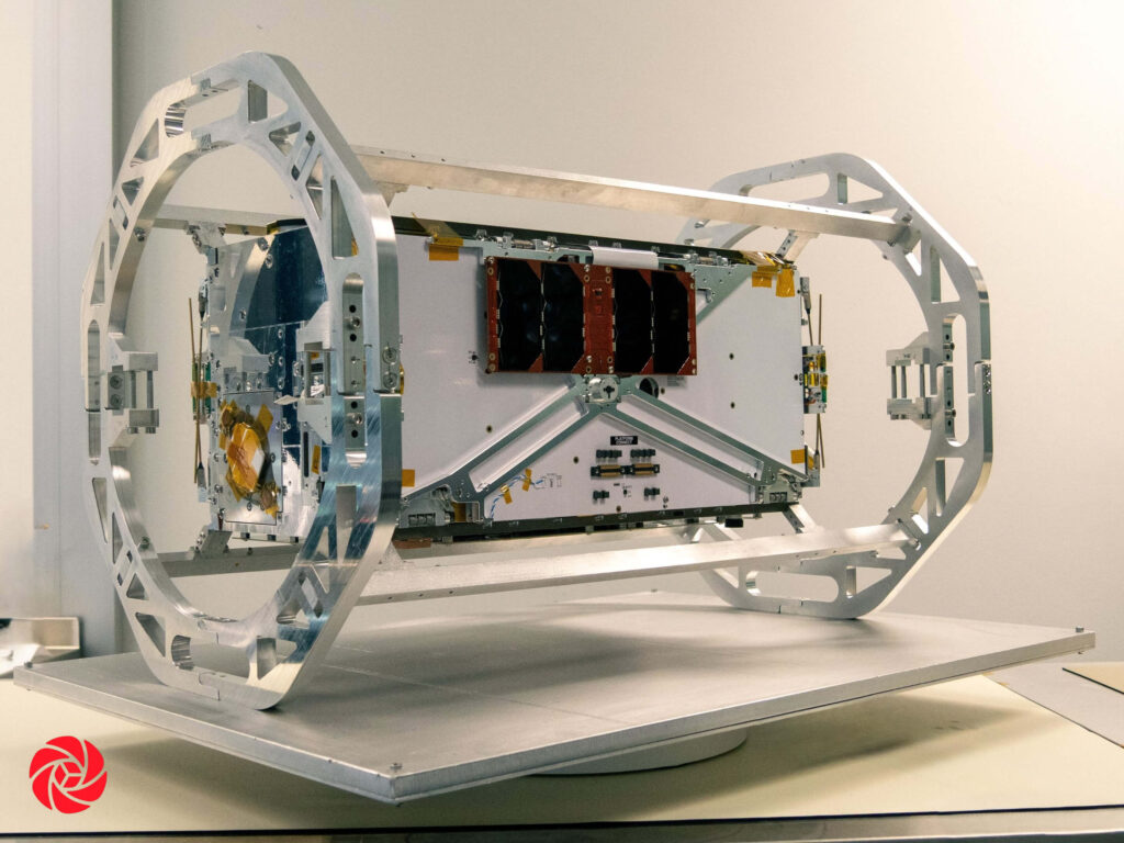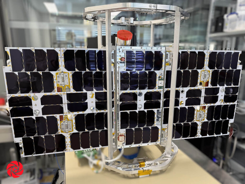 The image shows the zenith side of the GENA-OT satellite with all solar panels. – Ororatech GmbH